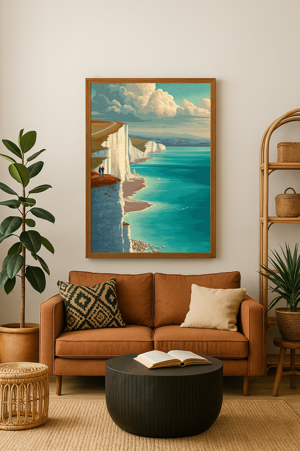 AI artwork depicting the famous Seven Sisters cliffs located in East Sussex in the South of England. These stunning white cliffs attract hundreds of thousands of visitor a year and are one of the most visited places in the UK. This poster showcases the iconic landmark in a retro travel poster style and are perfect for anyone who has visited the area and would like a reminder in their home.