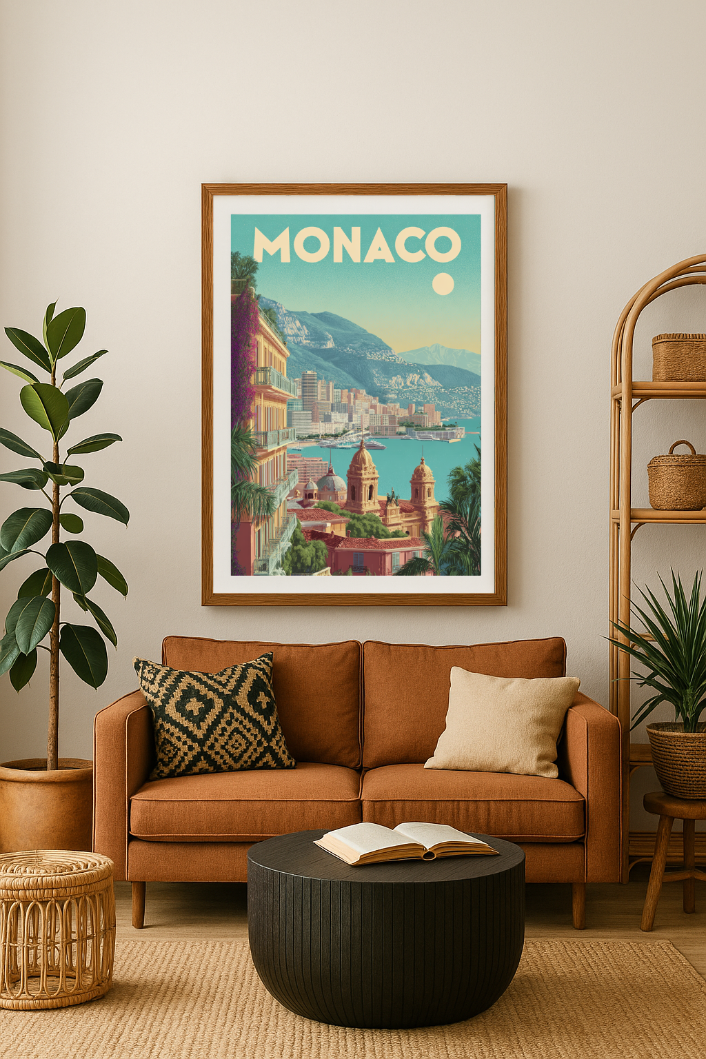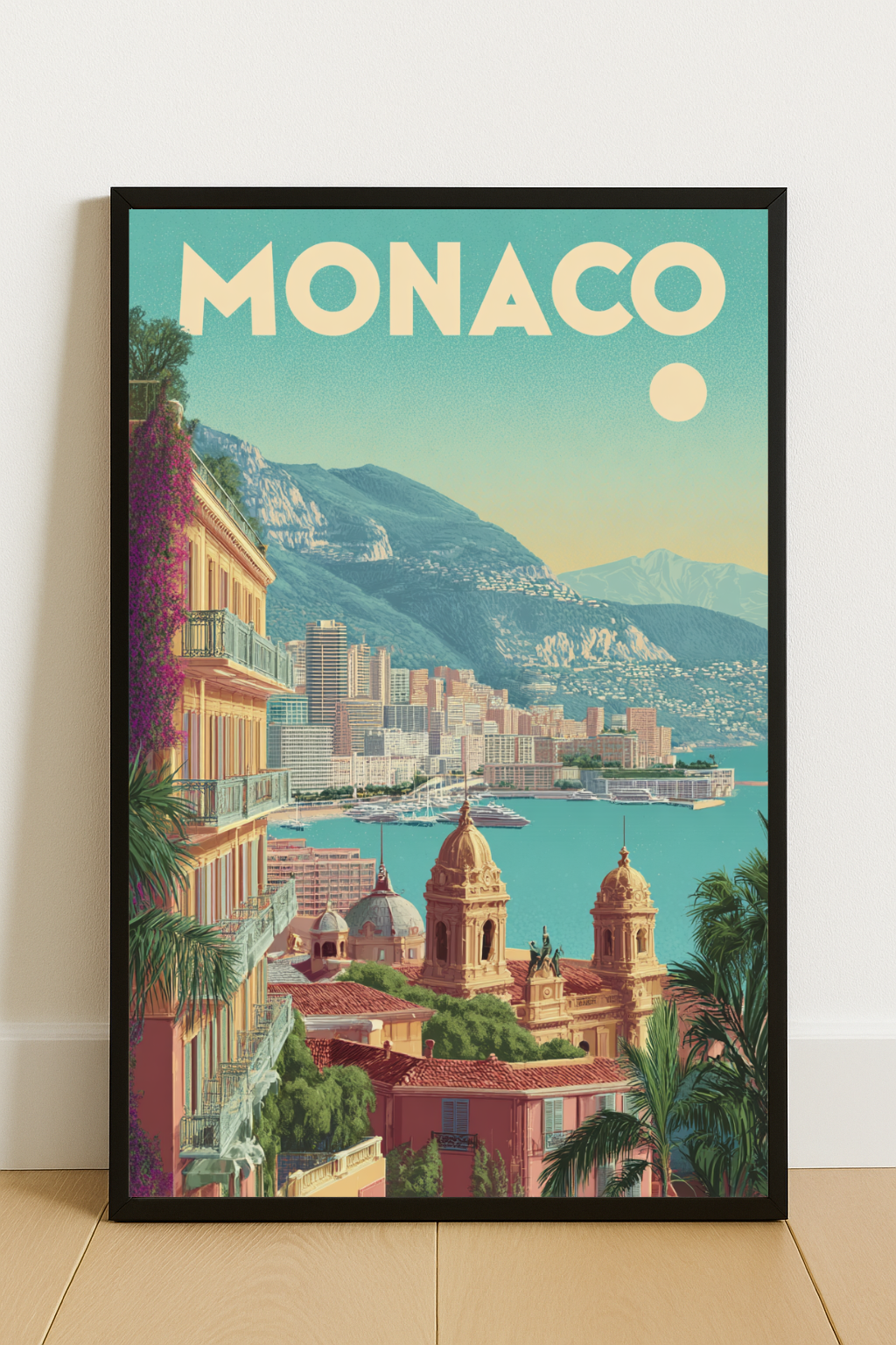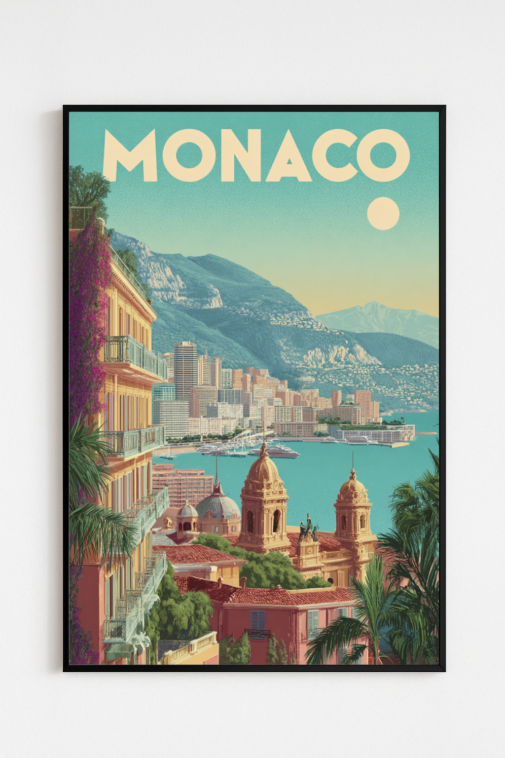 The home of celebs, fast cars and big yachts all set on a beautiful coastline. This retro style travel poster takes you back to the heyday of Monte Carlo.