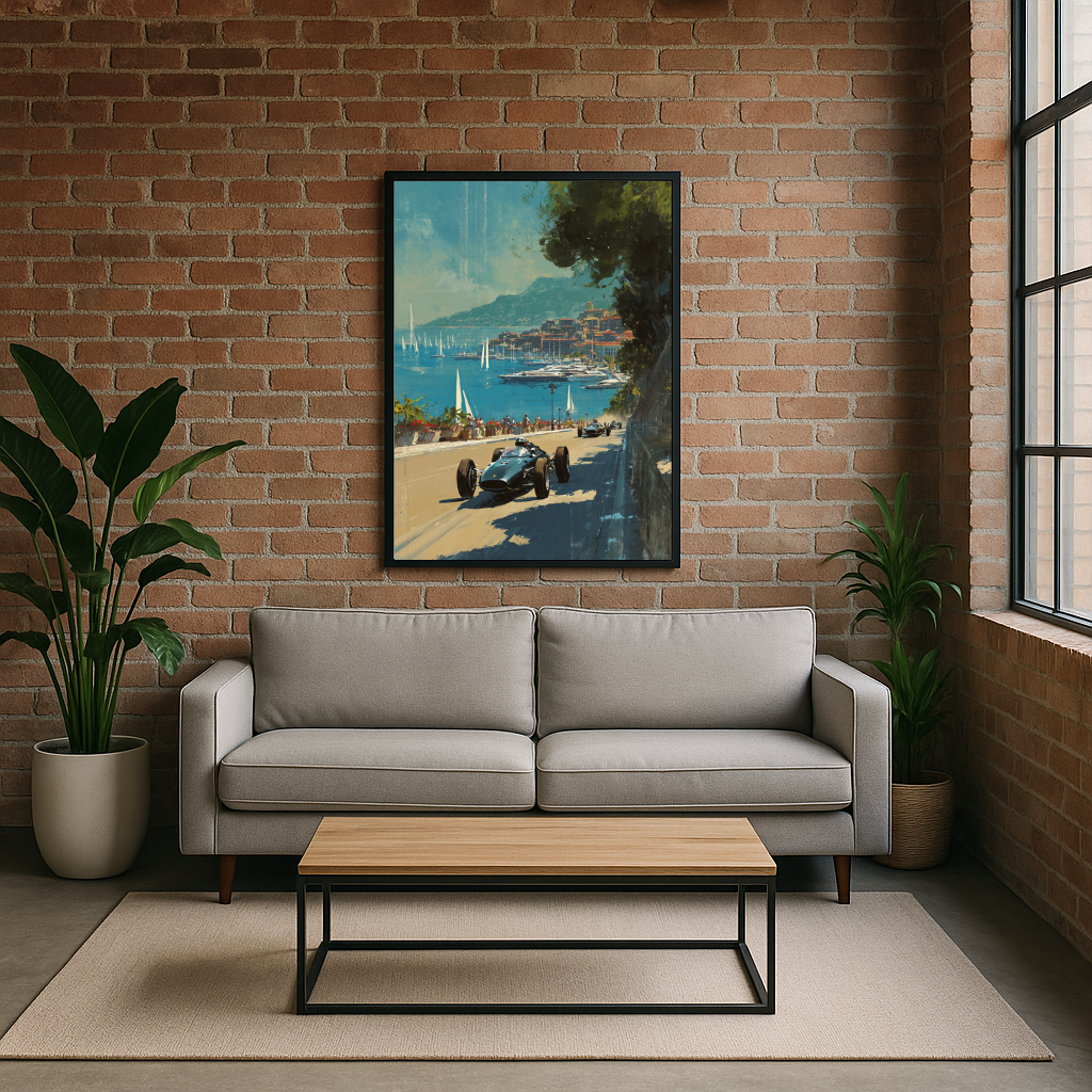 Artwork depicting a classic motor race with the sea, yachts and the town all featured in the background.