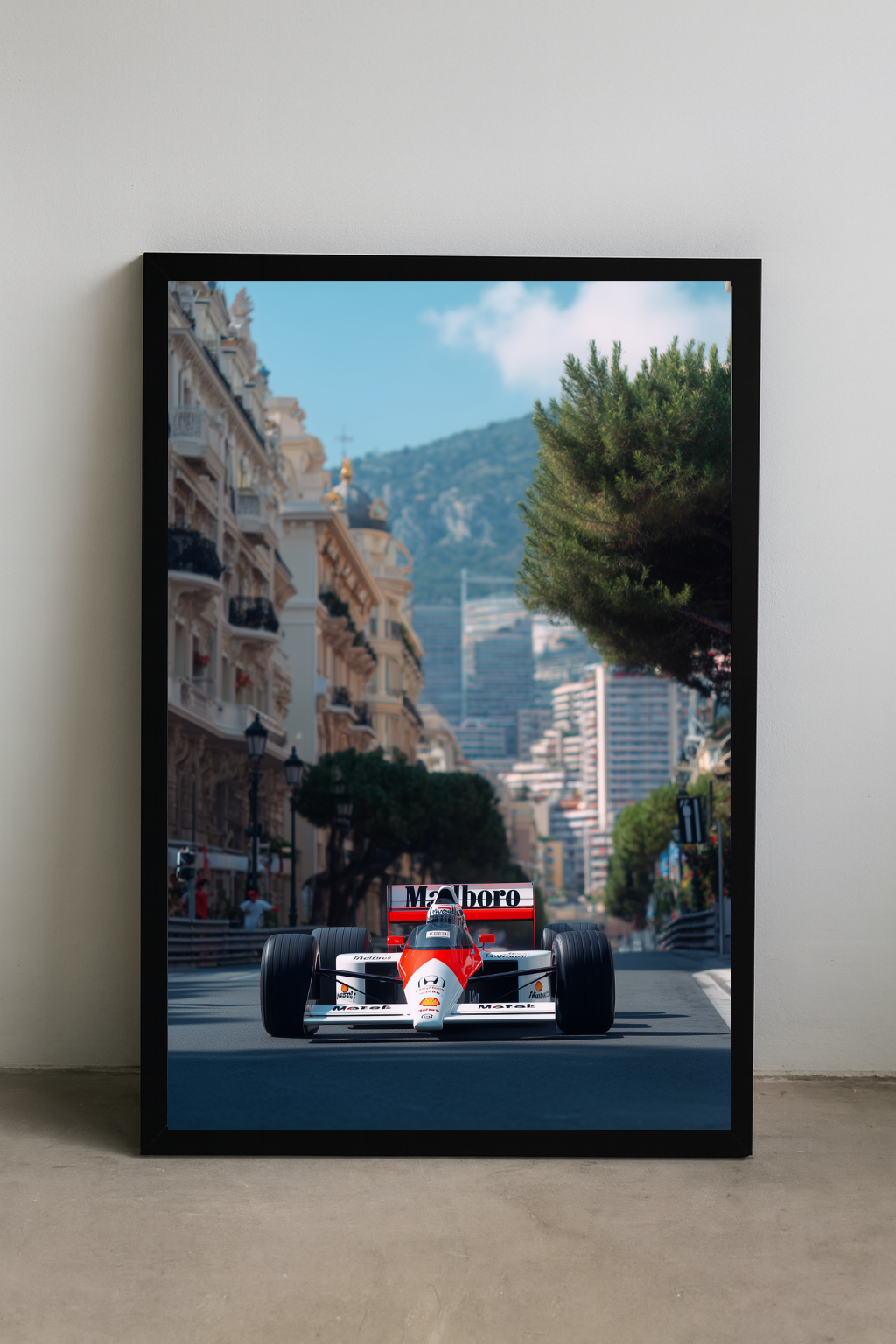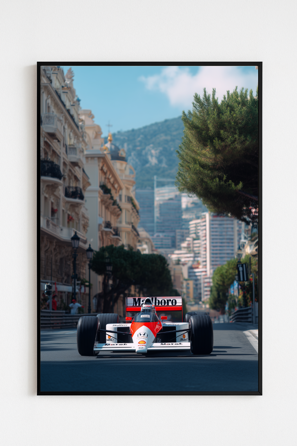 AI artwork, realistic painting of an 80's McLaren race car driving through Monaco.